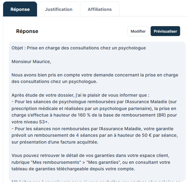 Les agents erenai automatisent les réponses aux adhérents dans les catégories les plus fréquentes de votre métier, telles que les garanties, les bénéficiaires, l’avancement des demandes en cours, les remboursements ou encore l’édition de documents, tout en routant les questions plus sensibles vers des agents qualifiés.