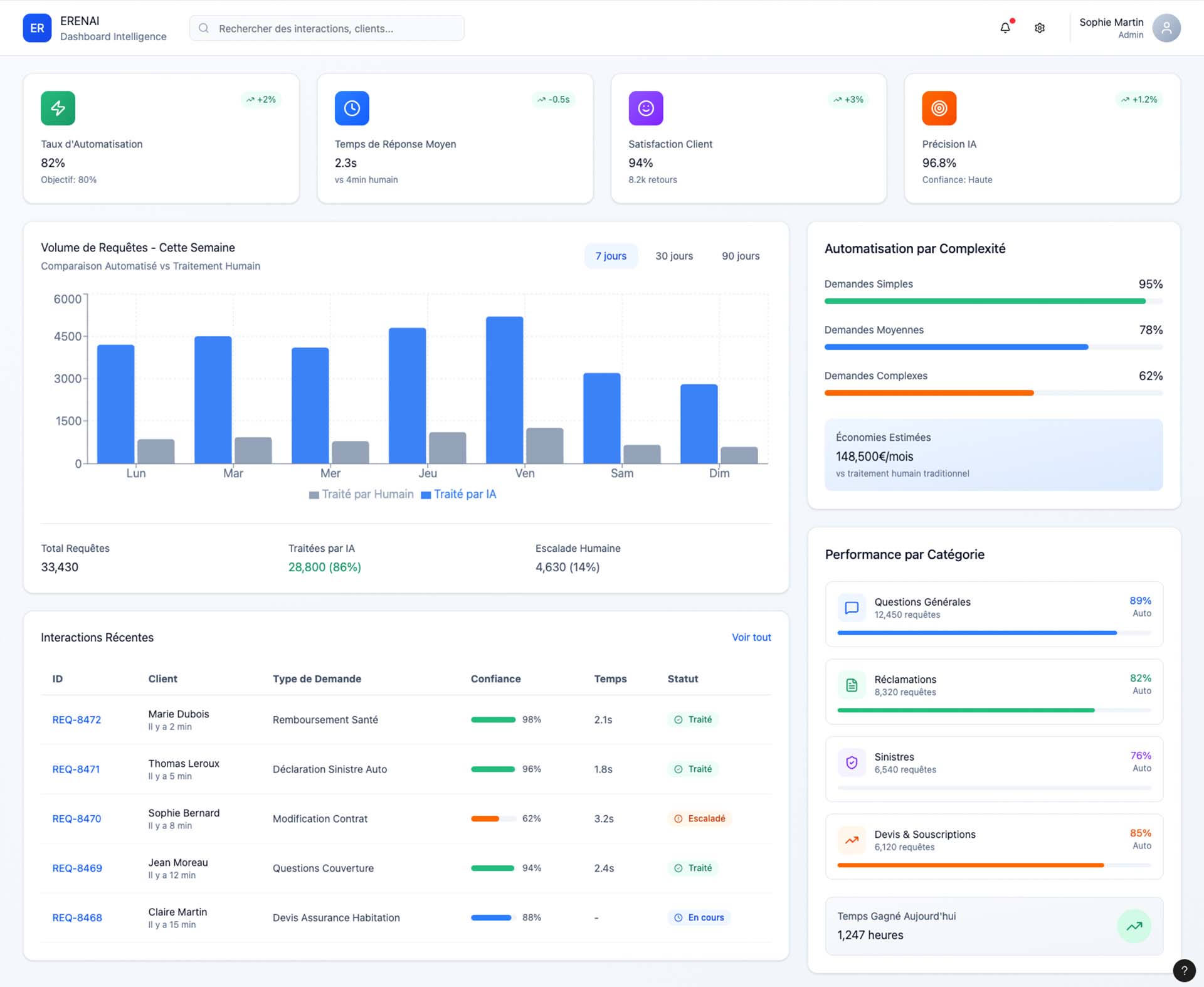 Notre modèle d’intelligence artificielle spécialisé et entraîné pour les métiers de l’assurance et de la mutuelle, traite automatiquement jusqu’a 80% des demandes de vos adhérents. Vous pouvez ainsi concentrer vos équipes support sur les tâches plus complexes et à forte valeur ajoutée.